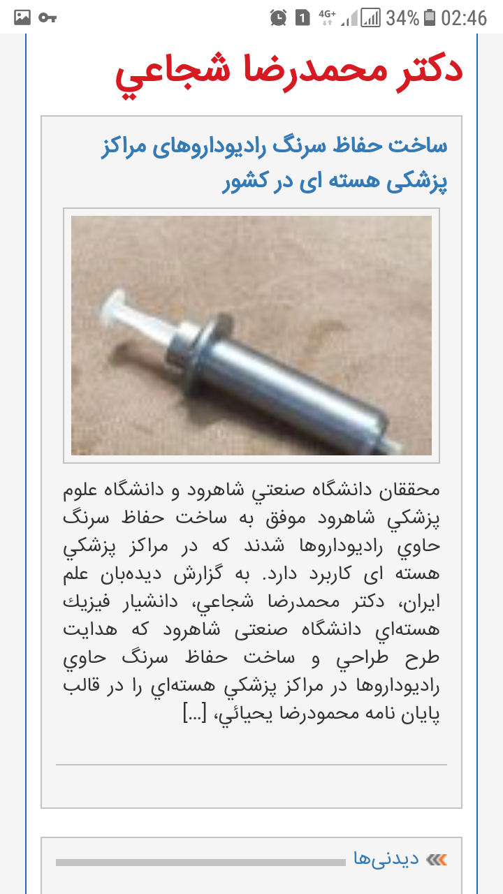 افتخارات علمی و اختراعات: طراحی و ساخت حفاظ رادیو داروهای مراکز پزشکی هسته ای کشور-- طراحی و ساخت فانتوم تیروئید - ساخت سرنگ تزریق ویژه مرکز پزشکی هسته ای