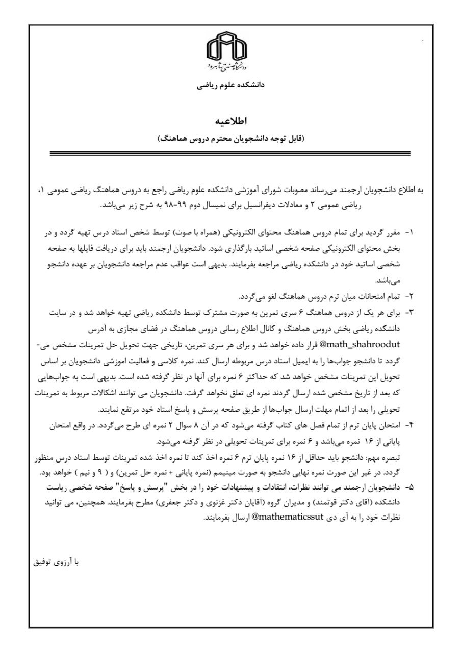 با سلام خدمت دانشجویان گرامی امیدوارم سلامت باشید. از امروز جلسات معادلات دیفرانسیل طبق برنامه هفتگی شما به صورت صوتی و pdf هم قرار خواهد گرفت. امیدوارم این فایل ها بتواند تا حدودی کمک نمایید. همچنین کلاس انلاین در سیستم سایاکام در ساعات کلاسی شما جهت رفع اشکال و توضیح بیشتر برگزار میشود. البته چناچه سوال یا نظراتی داشتید می توانید در قسمت پرسش و پاسخ و ایمیل بنده نیز مطرح نمایید. با تشکر