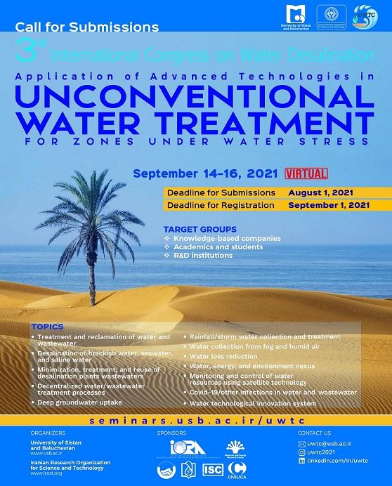 احتراماً به استحضار می رساند سومین "کنگره بین المللی نمک زدایی از آب شور: کاربرد فناور های پیشرفته در تصفی آب های غیرمتعارف برای مناطق تحت تنش آبی" بصورت مجازی در تاریخ 23 الی 25 شهریور 1400 توسط دانشگاه سیستان و بلوچستان و سازمان پژوهش های علمی و صنعتی برگزار خواهد شد. وب سایت کنگره به آدرس http://seminars.usb.ac.ir/uwtc جهت کسب اطلاعات تکمیلی در دسترس بوده و پوستر آن به پیوست تقدیم می گردد.