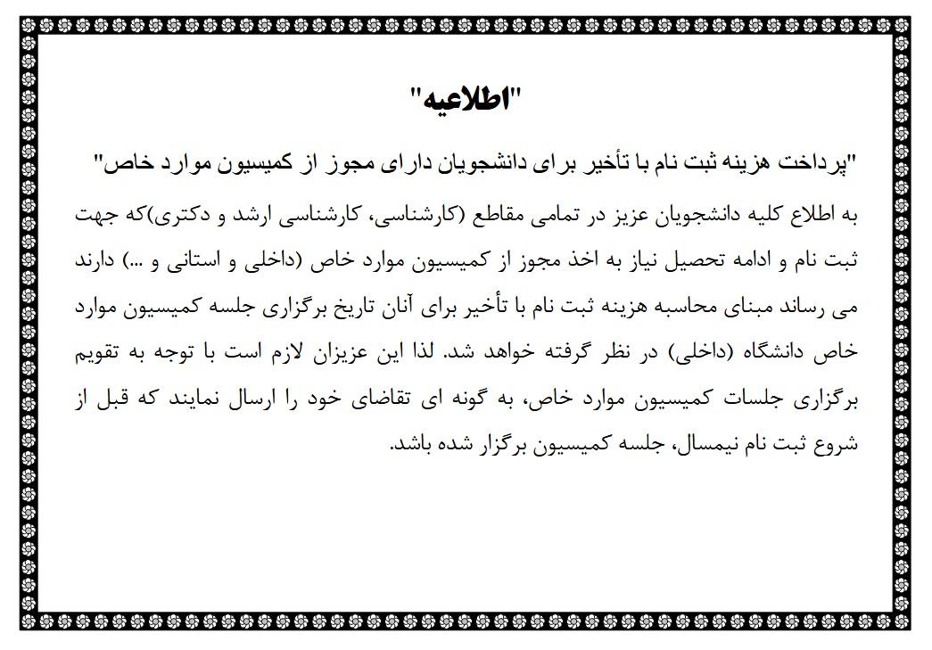 به اطلاع کلیه دانشجویان عزیز در تمامی مقاطع (کارشناسی، کارشناسی ارشد و دکتری)که جهت ثبت نام و ادامه تحصیل نیاز به اخذ مجوز از کمیسیون موارد خاص (داخلی و استانی و ...) دارند می رساند مبنای محاسبه هزینه ثبت نام با تأخیر برای آنان، تاریخ برگزاری جلسه کمیسیون موارد خاص دانشگاه(داخلی) در نظر گرفته خواهد شد. لذا این عزیزان لازم است با توجه به تقویم برگزاری جلسات کمیسیون موارد خاص، به گونه ای تقاضای خود را ارسال نمایند که قبل از شروع ثبت نام نیمسال، جلسه کمیسیون برگزار شده باشد.