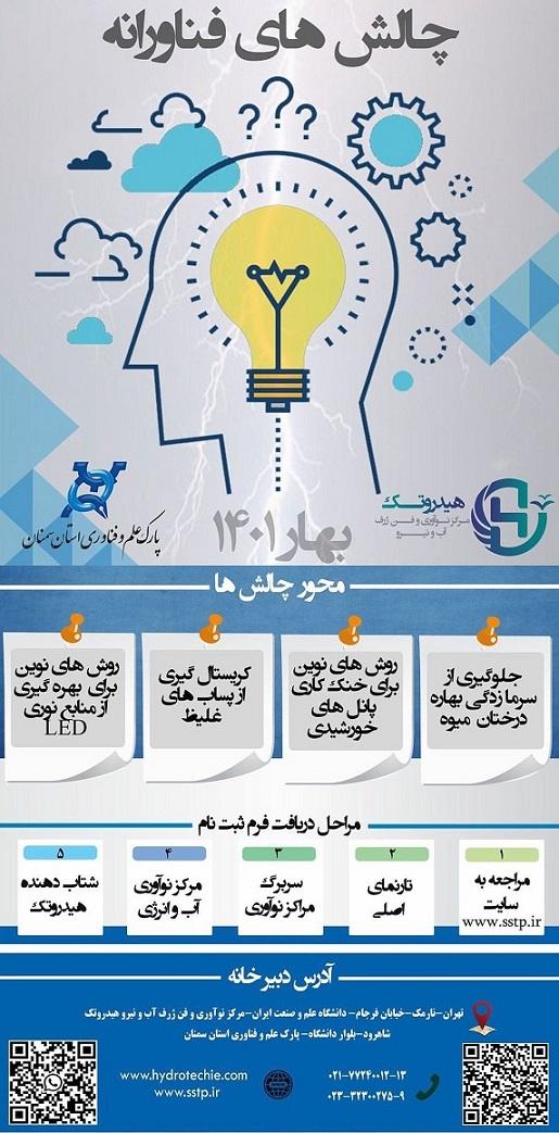 پارك علم و فناوري استان سمنان با همكاري شتاب دهنده هيدروتك اقدام به برگزاري رويداد چالشهاي فناوري در چهار حوزه تخصصي و كاربردي ذيل نموده است: