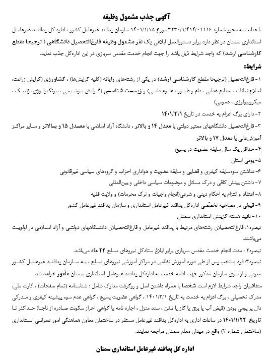 با عنایت به مجوز شماره 01116/414/1/3230 مورخ 15/1/1401 سازمان پدافند غیرعامل کشور، اداره کل پدافند غیرعامل استانداری سمنان در نظر دارد برابر دستورالعمل ابلاغی یک نفر مشمول وظیفه فارغ التحصیل دانشگاهی ( ترجیحا مقطع کارشناسی ارشد) که واجد شرایط ذیل باشد را جهت انجام خدمت مقدس سربازی در این ادارهکل جذب نماید.