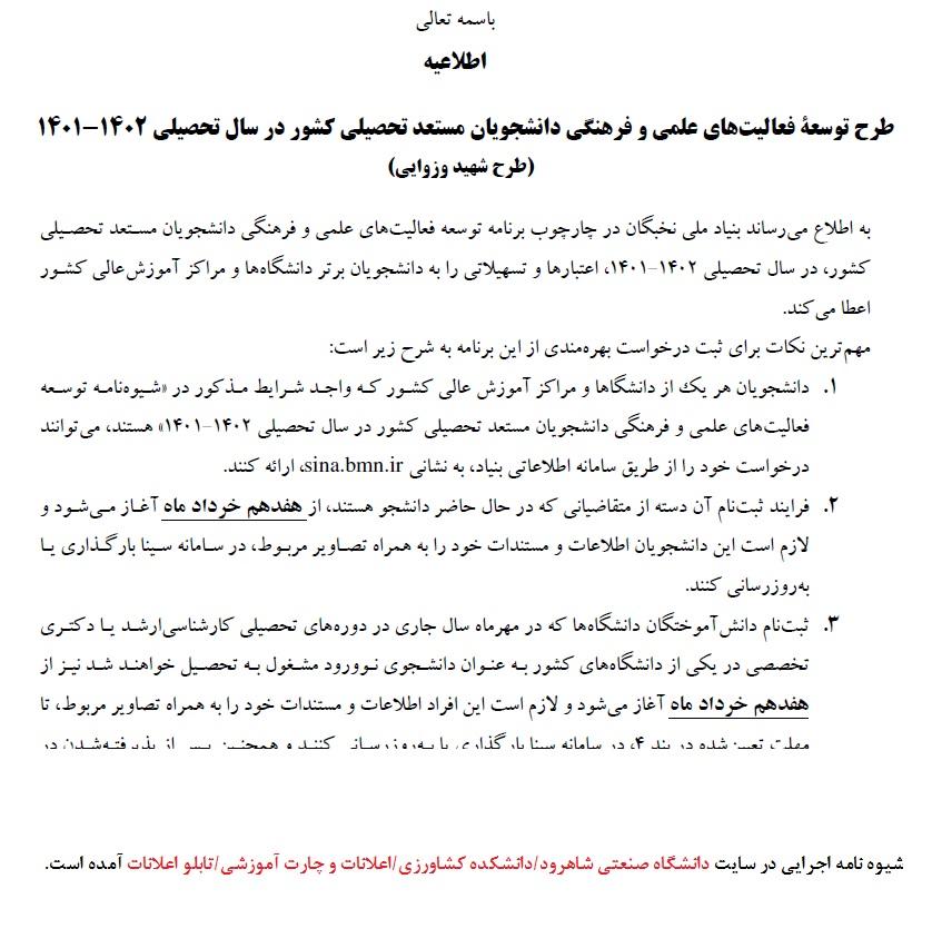 طرح توسعۀ فعالیتهای علمی و فرهنگی دانشجویان مستعد تحصیلی کشور در سال تحصیلی 1402-1401