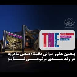 به گزارش روابط عمومی دانشگاه صنعتی شاهرود به نقل از دکتر محمد حسین احمدی سرپرست گروه همکاری علمی و بین المللی، دانشگاه صنعتی در رتبهبندی تایمز به عنوان یكی از مهمترین نظامهای رتبهبندی بینالمللی دانشگاه های جهان، برای پنجمین سال متوالی موفق به کسب رتبه 1001-1200 در میان دانشگاه های جهان شد.