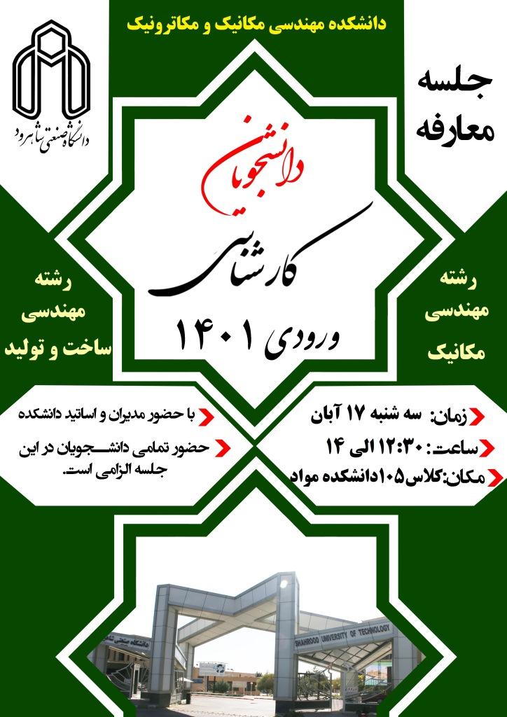 مراسم معارفه دانشجویان جدید کارشناسی مهندسی مکانیک و مهندسی ساخت و تولید در روز سه شنبه 17 آبان از ساعت 12:30 الی 14 در کلاس 105 دانشکده مهندسی شیمی و مواد برگزار می شود. لذا از همه دانشجویان جدیدالورود برای حضور در این مراسم دعوت به عمل می آید.