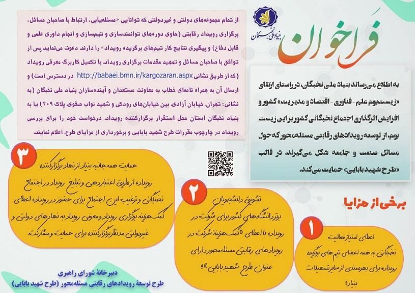 احتراماً به اطلاع می رساند بنیاد ملی نخبگان، در راستای ارتقای "زیست بوم علم-فناروی-اقتصاد و مدیریت" کشور و افزایش اثر گذاری اجتماع نخبگانی کشور بر این زیست بوم، از توسعه رویدادهای رقابتی مسئله محور که حول مسائل صنعت و جامعه شکل می گیرند، در قالب "طرح شهید بابایی" حمایت می کند.