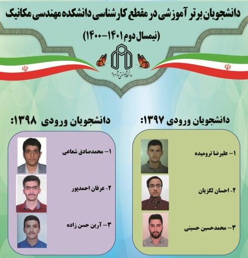 بدینوسیله از دانشجویان برتر آموزشی مقطع کارشناسی دانشکده در نیمسال دوم 1400-1401 تقدیر به عمل می آید.