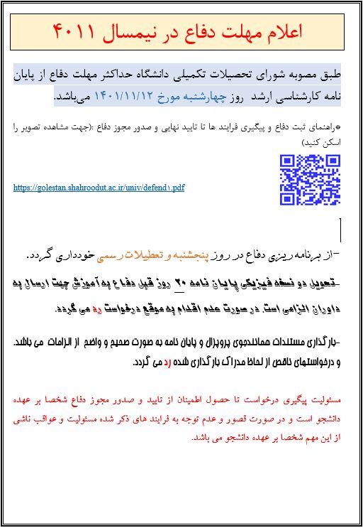 طبق مصوبه شوراي تحصيلات تكميلي دانشگاه حداكثر مهلت دفاع از پايان نامه كارشناسي ارشد روز چهارشنبه مورخ 12/11/1401 میباشد.