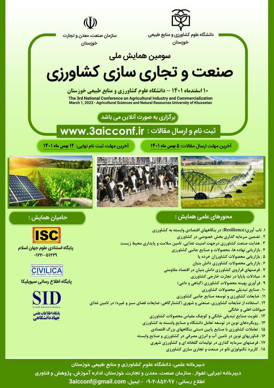 احتراماً به اطلاع می رساند دانشگاه علوم کشاورزی و منابع طبیعی خوزستان با همکاری سازمان صنعت، معدن و تجارت خوزستان در نظر دارد همایش ملی یک روزه با عنوان "سومین همایش ملی صنعت و تجاری سازی کشاورزی" را در تاریخ دهم اسفند ماه سال جاری برگزار نماید. آخرین مهلت ارسال مقالات 5 بهمن 1401 می باشد. فراخوان این همایش به آدرس اینترنتی www.3aicconf.ir قرار دارد.