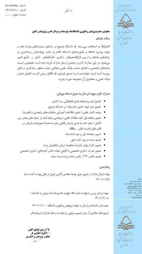 احتراماً به اطلاع می رساند که دانشگاه یاسوج در راستای سیاست های وزارت عتف و جهت پیشبرد اهداف و ماموریت های دانشگاه، اقدام به جذب پژوهشگران پسادکتری در رشته ها مختلف و از بین فارغ التحصیلات دکتری دانشگاه های داخل و خارج کشور می نماید.