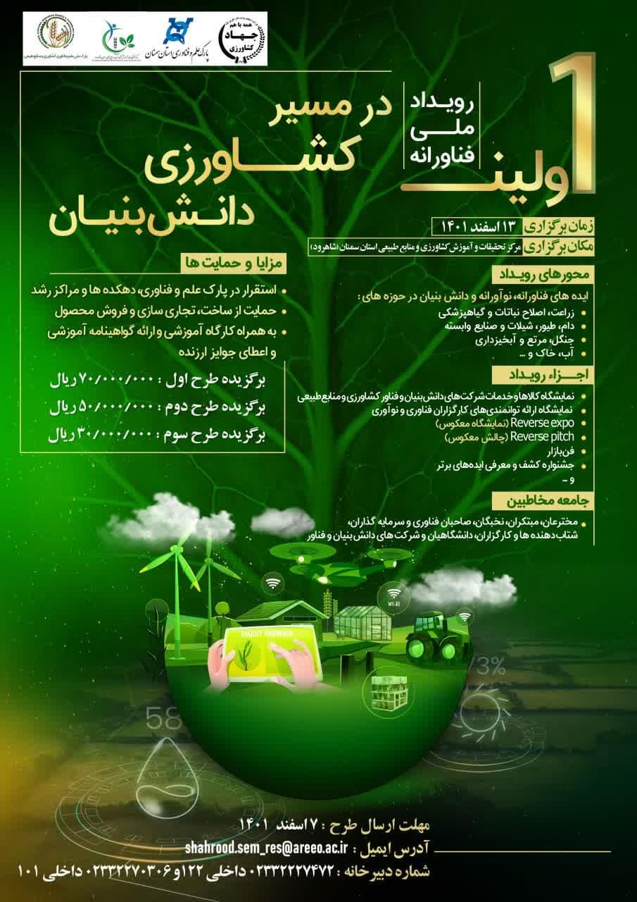 احتراماً به اطلاع می رساند مرکز تحقیقات و آموزش کشاورزی و منابع طبیعی استان سمنان (شاهرود) در نظر دارد نخستین رویداد استانی فناورانه کشاورزی و منابع طبیعی در مسیر دانش بنیان را در راستای تحقق شعار سال "تولید، دانش بنیان و اشتغال آفرین"، با هدف شناسایی، استقرار، توسعه و تکمیل زیست بوم فناوری و نوآوری کشاورزی و منابع طبیعی استان با هدف مشارکت حداکثری نخبگان، فناوران، نوآوران، متخصصین و دانشجویان، در تاریخ 13 اسفند ماه سال جاری در سطح استان برگزار نماید. لذا علاقه مندان و متقاضیان می توانند جهت دریافت فرم به آدرس http://shahrood.areeo.ac.ir مراجعه فرمایند.