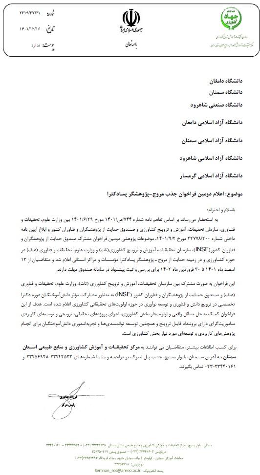 به استحضار میرساند بر اساس تفاهم نامه شماره 744 /ص/ 1401 مورخ 29/6/1401 بین وزارت علوم، تحقیقات و فناوري، سازمان تحقیقات، آموزش و ترویج کشاورزي و صندوق حمایت از پژوهشگران و فناوران کشور و ابلاغ آیین نامه داخلی شماره 200/22778 مورخ 2/9/1401، موضوعات پژوهشی دومین فراخوان مشترك صندوق حمایت از پژوهشگران و فناوران کشور(INSF)، سازمان تحقیقات، آموزش و ترویج کشاورزي (تات) و وزارت علوم، تحقیقات و فناوري (عتف) در حوزه کشاورزي و در زمینه حمایت از مروج پژوهشگر پسادکترا مؤسسات و مراکز استانی اعلام شد و متقاضیان از 13
