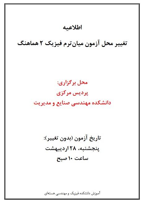 اطلاعیهتغییرمحلآزمونمیانترم فیزیک2هماهنگ