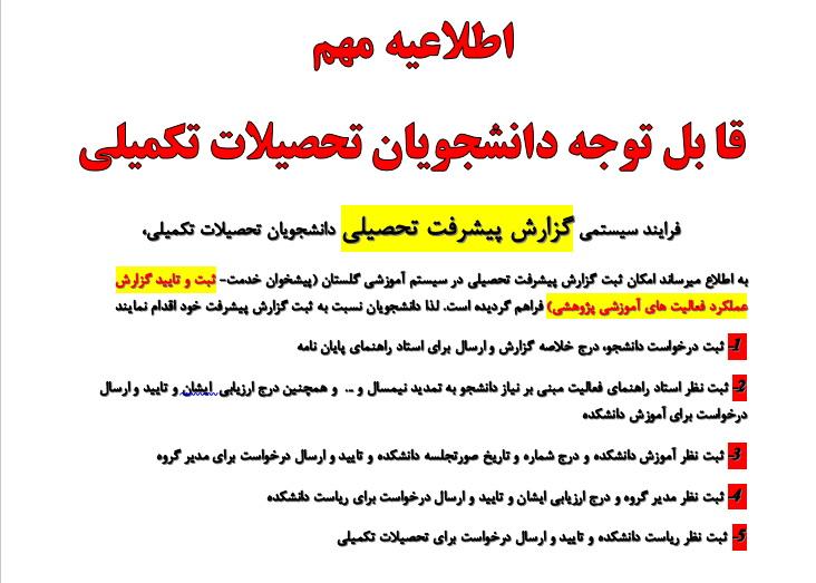 به اطلاع ميرساند امكان ثبت گزارش پیشرفت تحصیلی در سيستم آموزشي گلستان (پيشخوان خدمت- ثبت و تاييد گزارش عملكرد فعاليت هاي آموزشي پژوهشي) فراهم گرديده است. لذا دانشجویان نسبت به ثبت گزارش پیشرفت خود اقدام نمایند