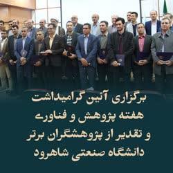 به گزارش روابط عمومی دانشگاه صنعتی شاهرود، در مراسم گراميداشت هفته پژوهش و فناوري پيش از ظهر روز دوشنبه 13 آذر ماه جاري با حضور هیئت رئیسه دانشگاه از پژوهشگران برتر اين دانشگاه در محل تالار زنده یاد دکتر پیروز دانشگاه تقدير به عمل آمد.