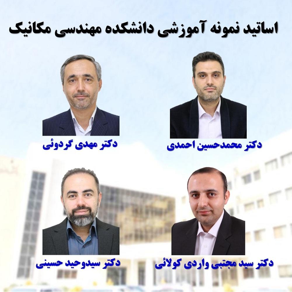 اساتید محترم جناب آقایان دکتر مهدی گردوئی، دکتر محمدحسین احمدی، دکتر سیدمجتبی واردی کولائی و دکتر سیدوحید حسینی به عنوان اساتید نمونه آموزشی دانشکده مهندسی مکانیک انتخاب شده و مورد قدردانی قرار گرفتند. دانشکده مهندسی مکانیک این افتخار را به همکاران منتخب تبریک می گوید.