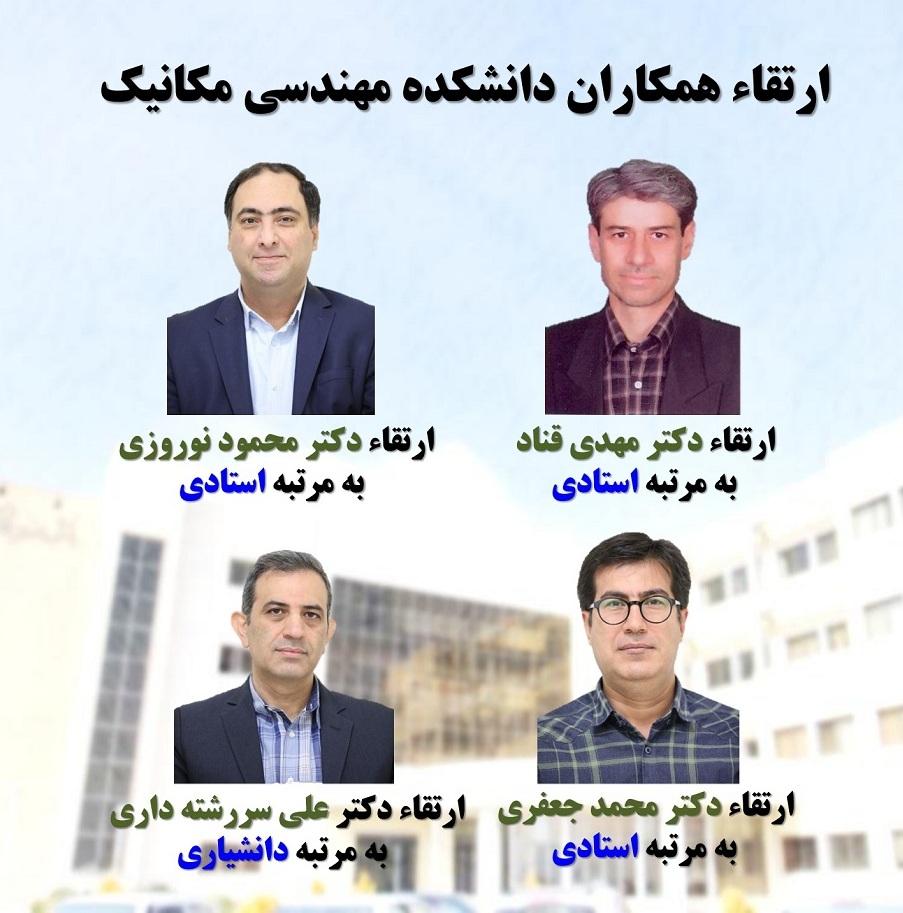 دانشکده مهندسی مکانیک ارتقاء مرتبه همکاران محترم را تبریک گفته و برای ایشان آرزوی سلامتی و موفقیت های بیشتر دارد.