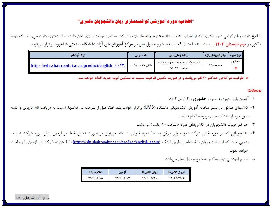 اخبار و رویدادها: دوره آﻣﻮزشی ﺗﻮاﻧﻤﻨﺪﺳﺎزي زﺑﺎن داﻧﺸﺠﻮﯾﺎن دکتري