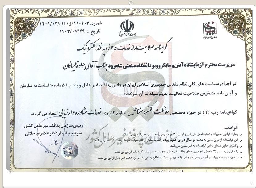 دکتر جواد قالیبافان عضو هیأت علمی دانشکده مهندسی برق و سرپرست آزمایشگاه آنتن و مایکروویو این دانشگاه در این خصوص گفت: اخذ گواهینامه صلاحیت ارائه خدمات در حوزه حفاظت الکترومغناطیس از سازمان پدافند غیرعامل کشور ، گواهینامه رتبه 2 در حوزه حفاظت الکترومغناطیس با کاربری مشاوره و ارزیابی، عضو کمیته تخصصی الکترونیک/سایبر سازمان پدافند غیرعامل کشور و قرارگرفتن در فهرست مشاوران و تامین کنندگان وزارت نفت با ابلاغ سازمان پدافند غیرعامل کشور را از جمله افتخارات و مجوز های آزمایشگاه آنتن و مایکروویو دانشگاه صنعتی شاهرود دانست.