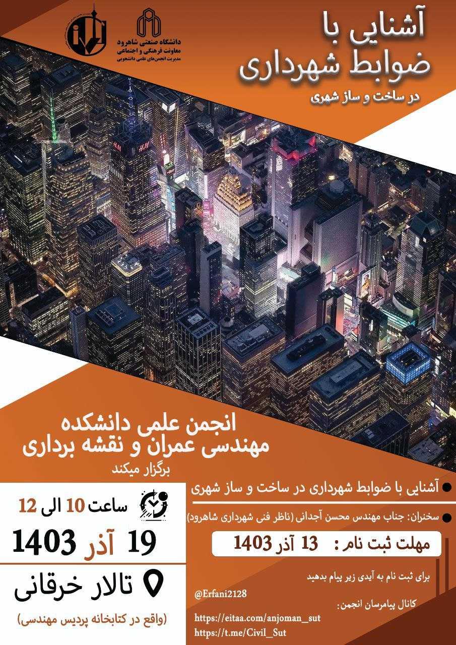 انجمن علمی دانشجویی مهندسی عمران دانشگاه صنعتی شاهرود همایش آشنایی با ضوابط شهرداری در ساخت و ساز شهری در تاریخ 19 آذر 1403 در سالن خرقانی کتابخانه پردیس برگزار میکند.