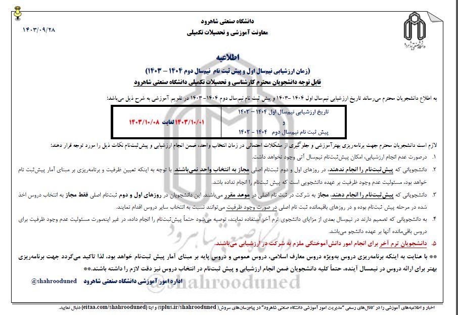 (زمان ارزشیابی نیمسال اول و پیش ثبت نام نیم¬سال دوم 1404 - 1403) قابل توجه دانشجویان محترم کارشناسی و تحصیلات تکمیلی دانشگاه صنعتی شاهرود