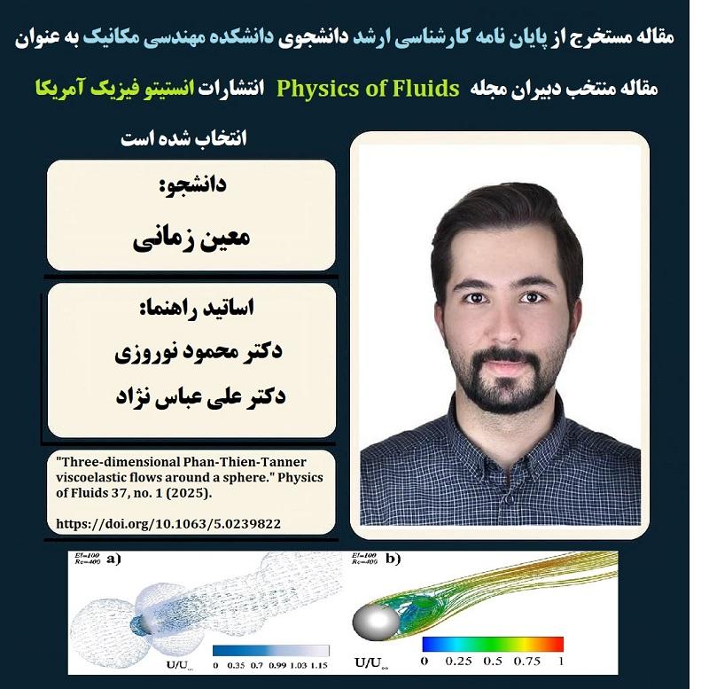 مقاله مستخرج از پایان نامه کارشناسی ارشد آقای معین زمانی، به راهنمایی آقایان دکتر محمود نوروزی و دکتر علی عباس نژاد، به عنوان مقاله منتخب دبیران مجله Physics of Fluids انتشارات انستیتو فیزیک آمریکا انتخاب شده است. این مجله یکی از دو مجله معروف مکانیک سیالات دنیا است و این انتخاب نشان از کیفیت بالای مقاله و پژوهش انجام شده دارد.