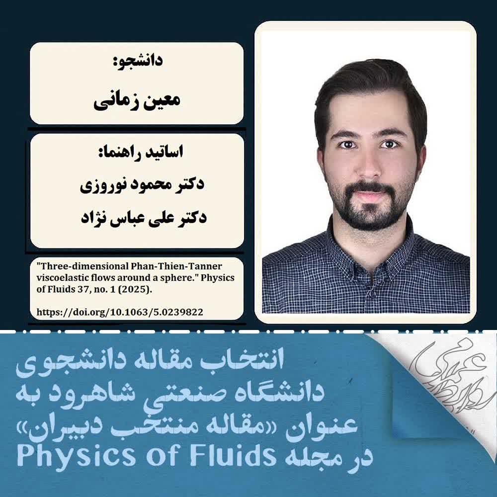 به گزارش روابط عمومی دانشگاه صنعتی شاهرود، مقالهای مستخرج از پایاننامه کارشناسی ارشد آقای معین زمانی، دانشجوی دانشکده مهندسی مکانیک، با راهنمایی دکتر محمود نوروزی و دکتر علی عباسنژاد و با همکاری دکتر علی میناییان (پژوهشگر پسادکتری در کشور چین و مشاور پایاننامه) و مهندس محمدحسین ایزدیفرد، به عنوان «مقاله منتخب دبیران» مجله Physics of Fluids انتخاب شد.