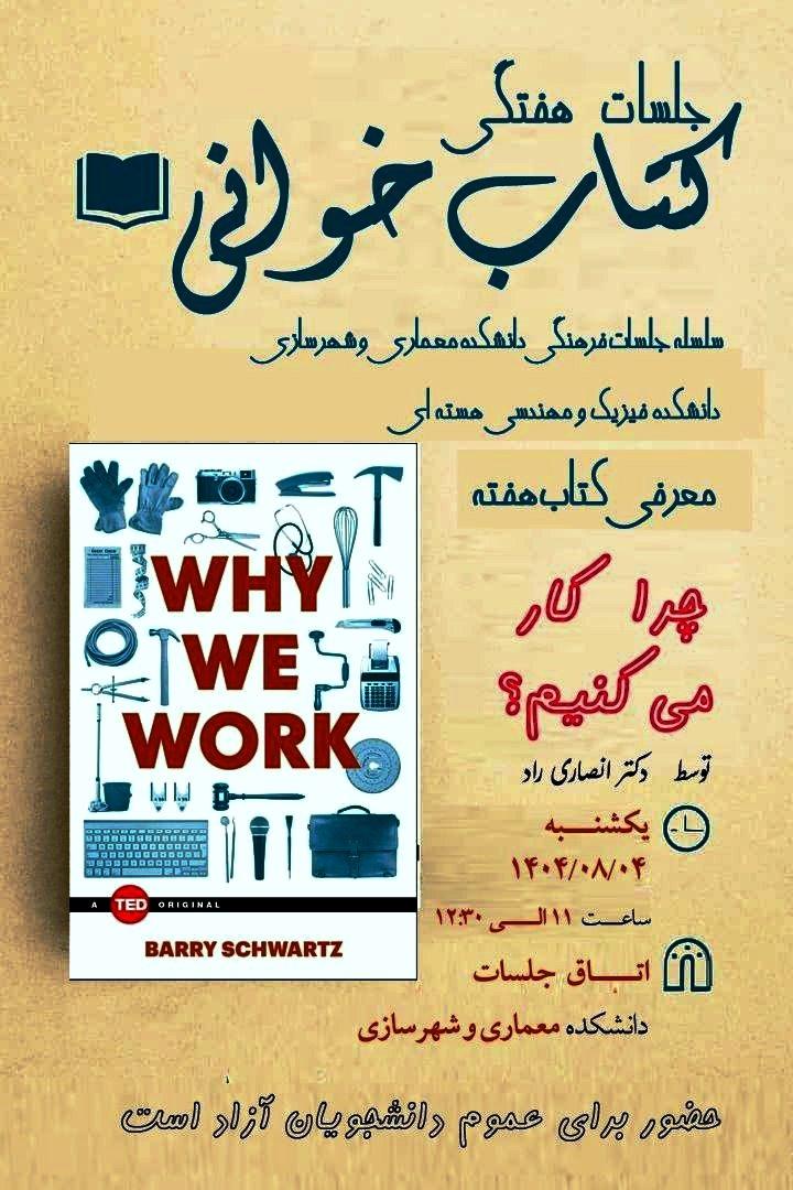 جلسه کتابخوانی این هفته در خصوص هم اندیشی و معرفی کتابِ چرا کارمی کنیم، توسط جناب آقای دکتر انصاری راد با شرکت دانشجویان برگزار گردید. جلسات هفتگی این دانشکده به صورت هفتگی برای عموم دانشجویان برگزار خواهد شد.