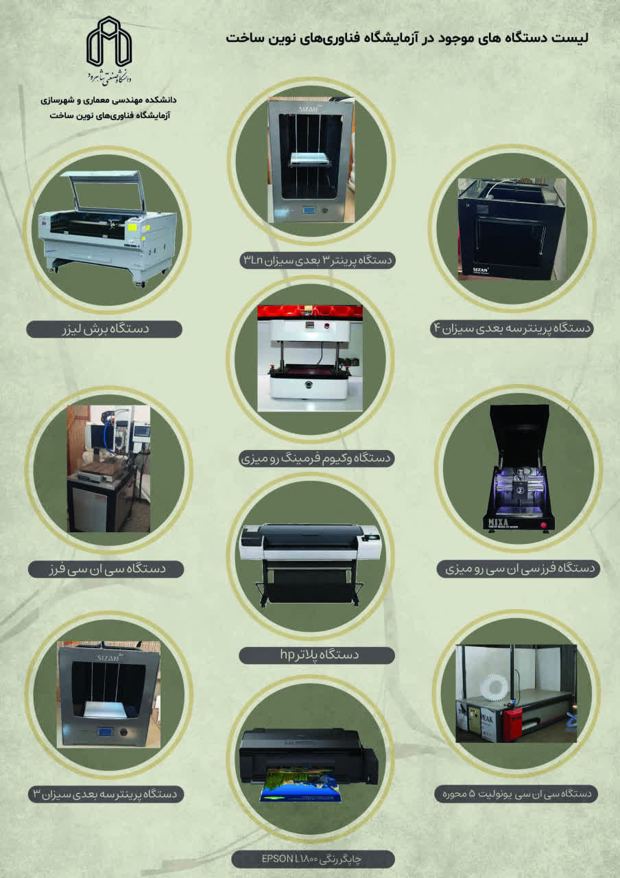 دستگاه های موجود در آزمایشگاه فنأوری های نوین ساخت و همچنین نمونه ای از ماکت های ساخته شده در این آزمایشگاه ، واقع در دانشکده مهندسی معماری