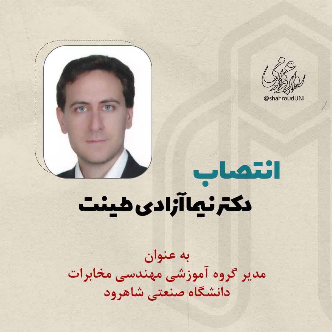 به گزارش روابط عمومی دانشگاه، طی حکمی از سوی دکتر مرتضی ایزدی فرد رئیس دانشگاه صنعتی شاهرود ضمن تقدیر از دکتر ولی الله مشایخی در کسوت مدیر گروه آموزشی مهندسی مخابرات، به مدت دو سال ؛ دکتر نیما آزادی طینت استادیار گروه آموزشی مهندسی مخابرات به عنوان مدیر گروه آموزشی مهندسی مخابرات منصوب گردید.