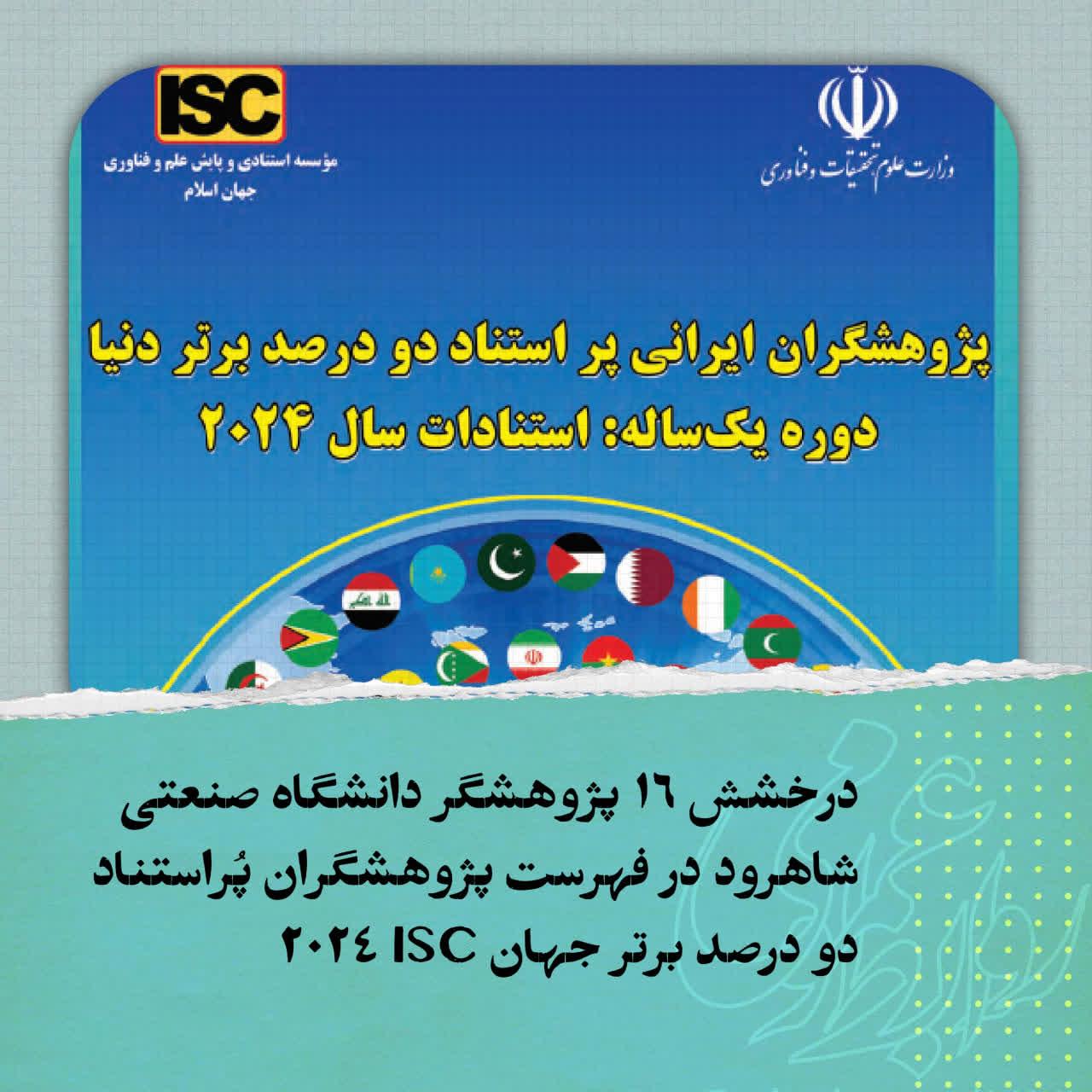 به گزارش روابط عمومی دانشگاه صنعتی شاهرود، بر اساس گزارش رسمی پژوهشگران ایرانی پُراستناد دو درصد برتر دنیا عملکرد یکساله (استنادات سال ۲۰۲۴) که از سوی مؤسسه استنادی و پایش علم و فناوری جهان اسلام (ISC) به دانشگاهها ابلاغ شده است، ۱۶ پژوهشگر از دانشگاه صنعتی شاهرود در فهرست پژوهشگران اثرگذار سال ۲۰۲۴ قرار گرفتهاند. این فهرست بر اساس تحلیل دادههای استنادی بازه زمانی ۱۹۶۰ تا ۲۰۲۴ و ارزیابی پژوهشگران در ۲۰ حوزه موضوعی اصلی و ۱۷۴ حوزه فرعی تهیه شده است.