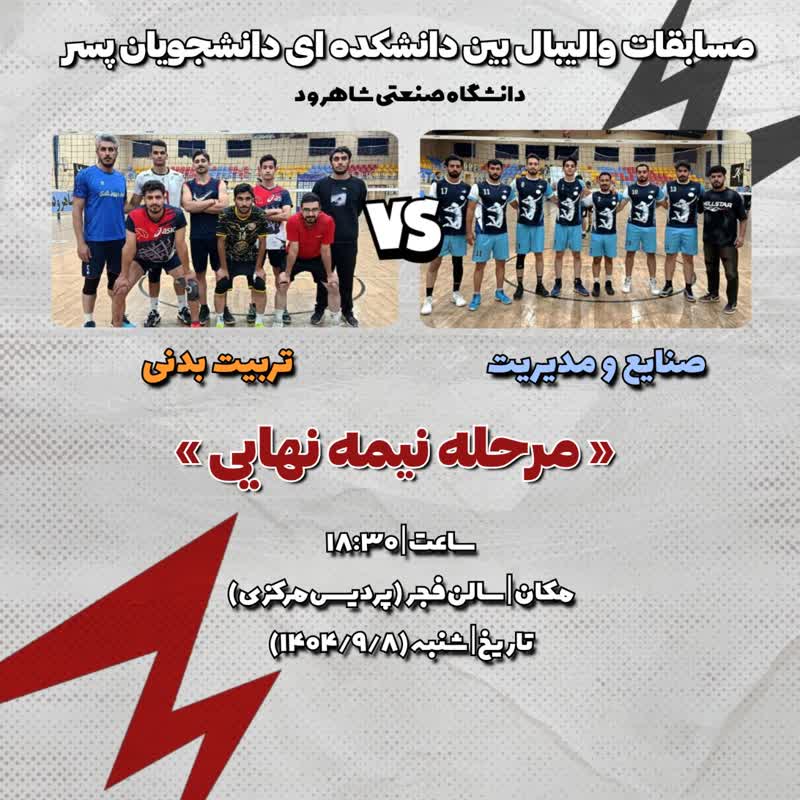 نیمه نهایی مسابقات : تربیت بدنی vs صنایع و مدیریت ساعت: ۱۸:۳۰