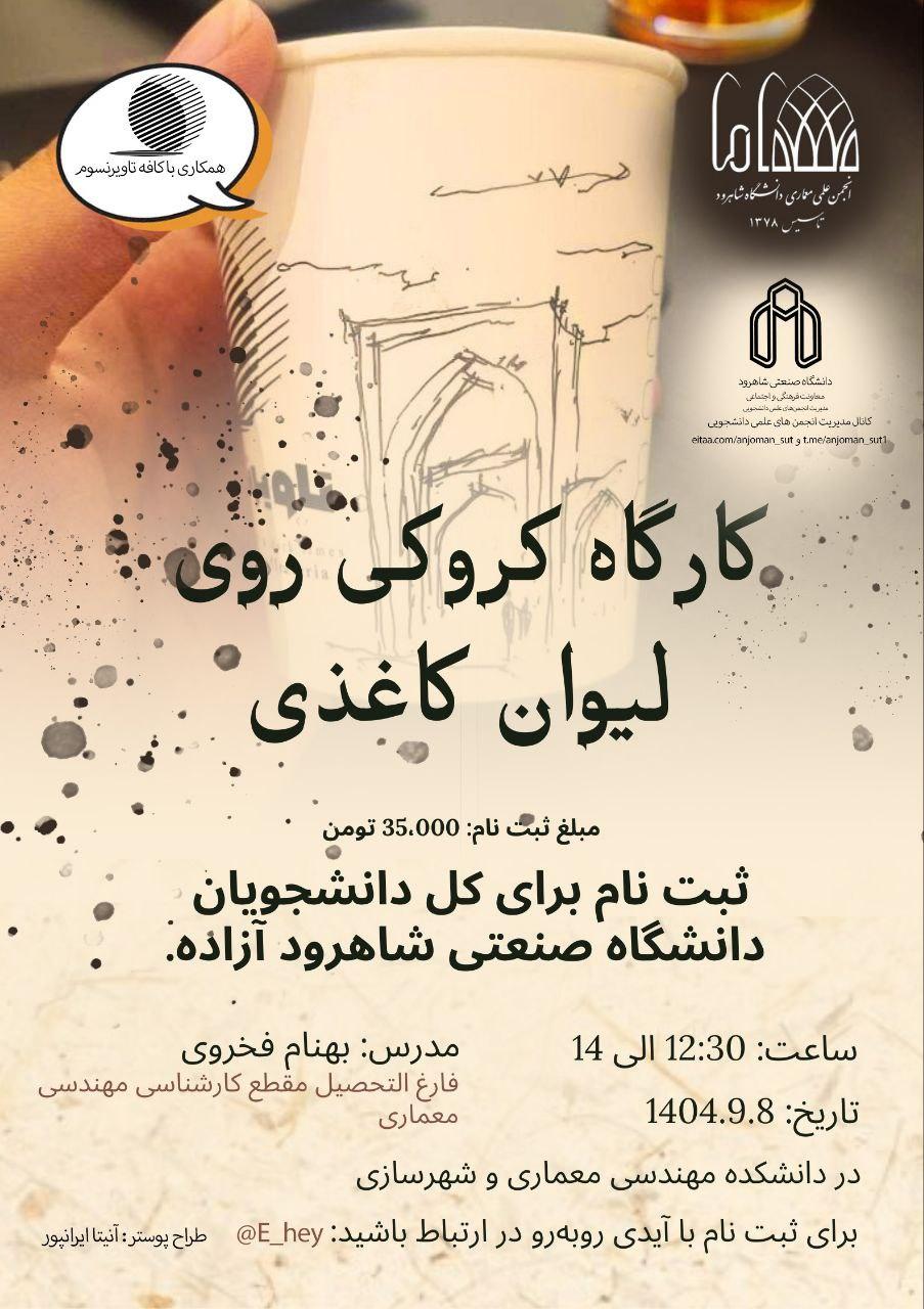 به همت گروه انجمن علمی دانشجویی دانشکده مهندسی معماری با همکاری کافه تاویرنسوم کارگاهی با عنوان کروکی روی لیوان کاغذی برگزار گردید.