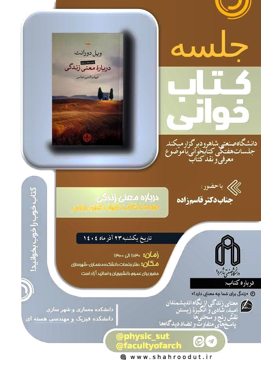 جلسه کتاب خوانی این هفته را به معرفی و نقد کتاب: درباره معنای زندگی با حضور جناب دکتر قاسم زاده، اختصاص خواهیم داد.با حضور ارزشمندتان همراه ما باشید.