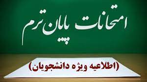 به اطلاع می رساند به منظور حفظ آرامش و رفاه حال دانشجویان گرامی، امتحانات پایان نیمسال جاری از روز شنبه چهارم بهمن ماه لغایت روز پنجشنبه شانزدهم بهمن ماه به صورت حضوری