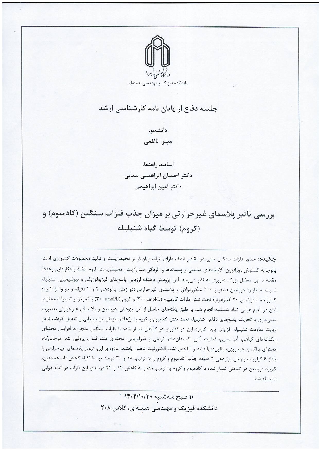 جلسه دفاع از پايان نامه كارشناسي ارشد خانم ميترا ناظمي (دانشجوی كارشناسي ارشد مهندسي هسته اي/كاربرد پرتوها)