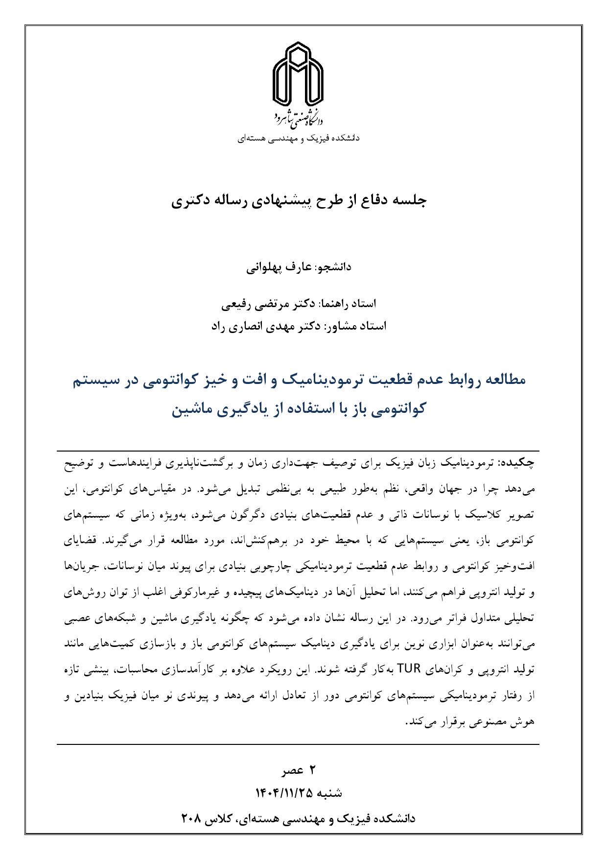 جلسه دفاع از طرح پيشنهادي رساله دکتری آقاي عارف پهلواني (دانشجوی دکتری گرايش ذرات بنيادي )