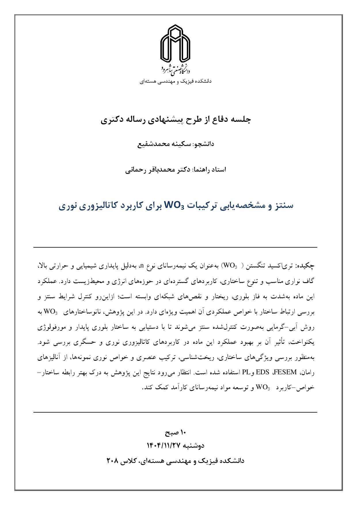 اخبار و رویدادها: جلسه دفاع از طرح پيشنهادي رساله دکتری خانم سكينه محمد شفيع (دانشجوی دکتری گرايش نانو فيزيك )
