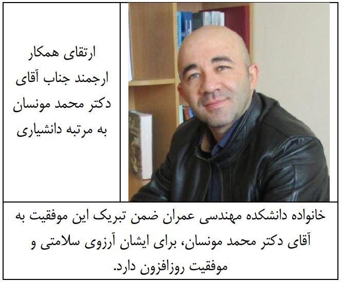 خانواده دانشکده مهندسی عمران ضمن تبریک این موفقیت به آقای دکتر محمد مونسان، برای ایشان آرزوی سلامتی و موفقیت روزافزون دارد.