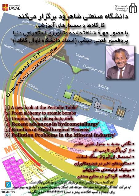 دکتر محمد کارآموزیان دبیر برگزاری این کارگاه ها در گفتگو با روابط عمومی این دانشگاه گفت: سمینارهای آموزشی و کارگاه های این دوره توسط پروفسور فتحی حبشی استاد دانشگاه لاوال کانادا و از چهره های شاخص متالورژی استخراجی جهان برگزار می شود. وی در مورد محتوای این سمینار افزود: سمینار و کارگاه ها در 6 بخش نگاهی جدید به جدول تناوبی عناصر، از کیمیاگری تا بمب اتم، استحصال اورانیوم از سنگ فسفات، دستاوردهای اخیر در هیدرومتالورژی، سینتیک فرایندهای متالورژیکی و مشکلات آلودگی در صنایع معدنی ارائه می شود.