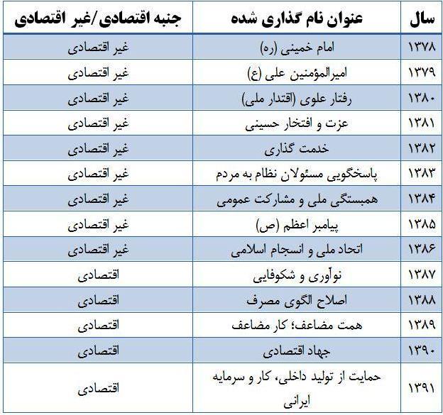 دستهای از این نام گذاریها بر اساس ضرورتهای اجتماعی-اقتصادی میباشد که از جمله آن میتوان به اصلاح الگوی مصرف، همت مضاعف؛ کار مضاعف و تشویق به جلوگیری از اسراف اشاره داشت. دسته ای دیگر به موارد بینالمللی مربوط میباشد. مانند نام گذاری سال ۱۳۸۵ به نام مبارک پیامبر اعظم (ص) که در پی اهانت به ساحت مقدس آن بزرگوار انجام شد. دسته ای دیگر به موارد فرهنگی و مذهبی مربوط میباشد، همچون سالهای امام علی(ع) و امام حسین (ع) و سال امام خمینی (ره).