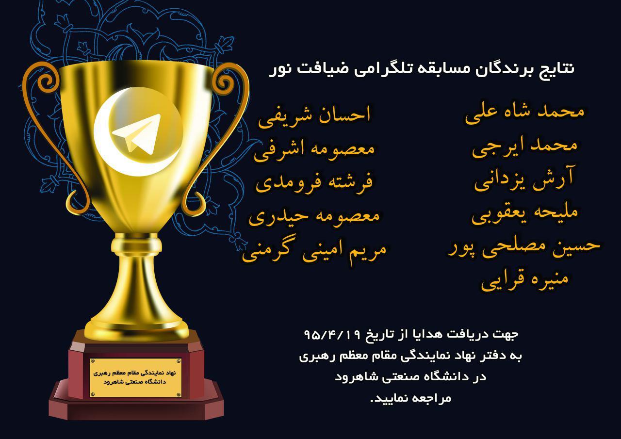 حجت الاسلام فندرسکی گفت: محمد شاه علی، احسان شریفی، محمد ایرجی، آرش یزدانی، ملیحه یعقوبی، حسین مصلحی پور، منیره قرایی، معصومه اشرفی، فرشته فرومدی، معصومه حیدری و مریم امینی گرمنی نفرات برتر مسابقه تلگرامی ضیافت نور در دانشگاه صنعتی شاهرود هستند.