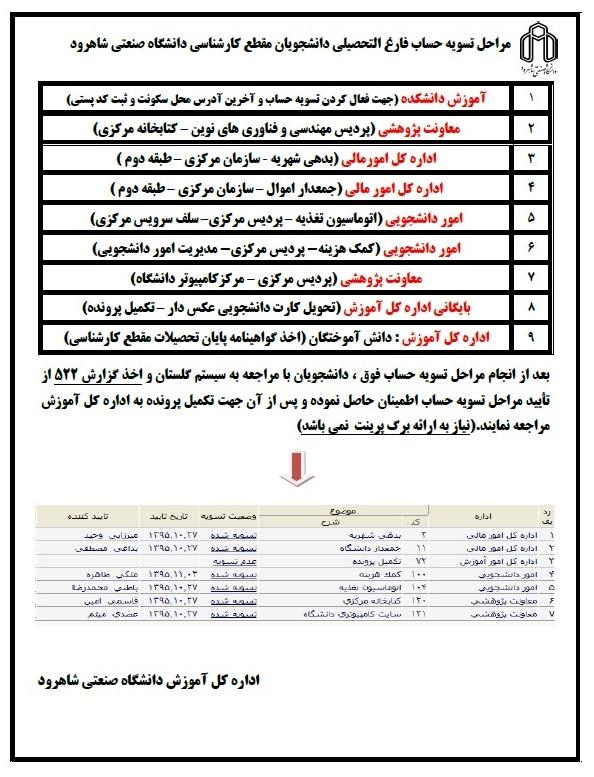احتراماً مراحل تسويه حساب فارغ التحصيلي دانشجويان مقطع كارشناسي به شرح پيوست ارسال مي گردد لذا خواهشمند است دستور فرماييد تا نسبت به اطلاع رساني لازم به دانشجويان دانشكده ذيربط اقدام لازم به عمل آيد.