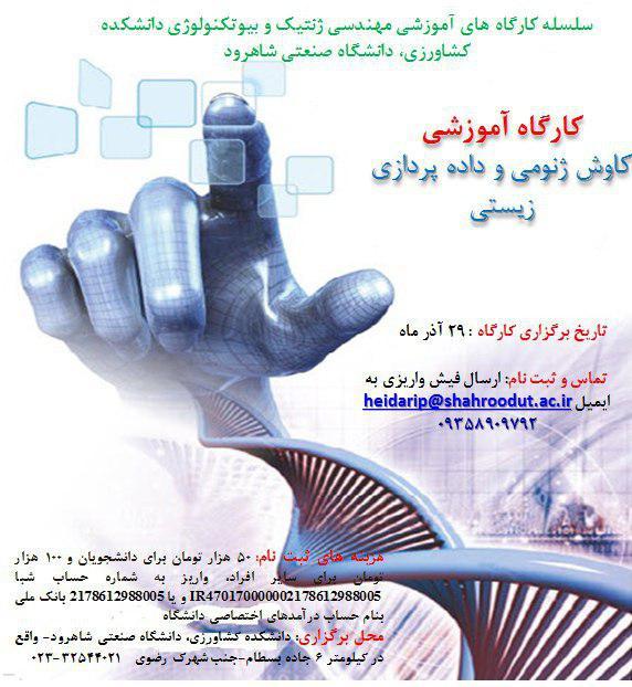 احتراما به استحضار مي رساند كه كارگاه آموزشي يك روزه تحت عنوان "كاوش ژنومي و داده پردازي زيستي" در تاريخ 29 آذر ماه توسط اساتيد گروه بيوتكنولوژي- دانشكده كشاورزي، دانشگاه صنعتي شاهرود برگزار مي شود. كليه محققين و علاقمندان در زمينه زيست شناسي و بيوتكنولوژي مي توانند در اين كارگاه شركت نمايند. در پايان به شركت كنندگان در كارگاه گواهي معتبر ارانه خواهد شد.