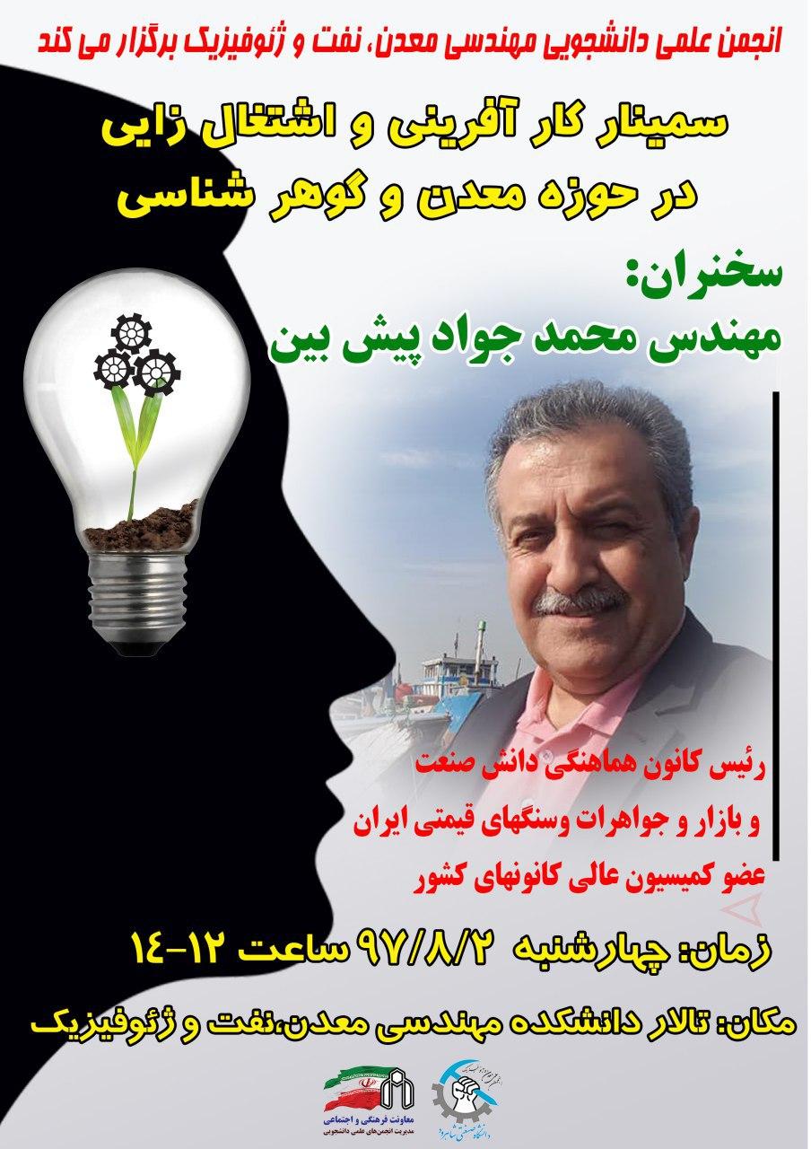 در این سمینار که به همت انجمن علمی دانشجویی مهندسی معدن، نفت و ژئوفیزیک برگزار شد، آقای مهندس جواد پیش بین رییس کانون هماهنگی دانش صنعت و بازار و جواهرات و سنگهای قیمتی ایران و عضو کمیسیون عالی کانونهای کشور، در مورد کارآفرینی و اشتغالزایی در حوزه معدن و گوهر شناسی ایراد سخن کردند.