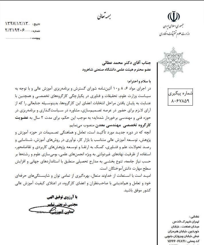در این حکم آمده است: "در اجرای مواد 6،8 و 10 آئین نامه شورای گسترش و برنامه ریزی آموزش عالی و با توجه به سیاست وزارت علوم، تحقیقات و فناوری در یکپارچگی در کار گروه های تخصصی و همچنین با عنایت به پایان یافتن مراحل انتخاب اعضای این کارگروه ها، بدینوسیله جنابعالی را که از آرای لازم برای حضور در عرصه تصمیم سازی، مشاوره در سیاست گذاری و برنامه ریزی در حوزه فنی و مهندسی برخوردار شده اید، به موجب این حکم برای مدت 2 سال به عضویت کارگروه تخصصی مهندسی معدن منصوب می نمایم"