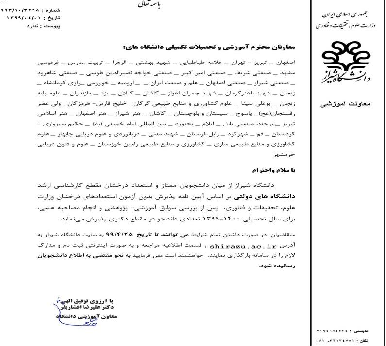 احتراما به اطلاع می رساند دانشگاه شیراز برای سال تحصیلی 1400- 1399 از میان دانشجویان ممتاز و استعداد درخشان مقطع کارشناسی ارشد دانشگاه های دولتی بر اساس آیین نامه پذیرش بدون آزمون استعدادهای درخشان وزارت علوم، تحقیقات و فناوری، تعدادی دانشجو در مقطع دکتری پذیرش می نماید. لذا دانشجویان گرامی که متمایل به استفاده از شرایط مزبور هستند حداکثر تا تاریخ 25/4/1399 به سایت دانشگاه شیراز به نشانی shirazu.ac.ir، قسمت اطلاعیه مراجعه و به صورت اینترنتی ثبت نام و مدارک لازم را در سامانه بارگزاری نمایند.