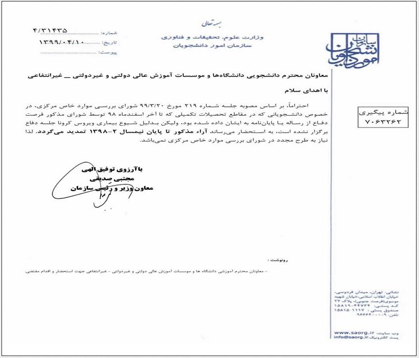قابل توجه دانشجویان گرامی تحصیلات تکمیلی، آن دسته از عزیزانی که زمان دفاع از رساله یا پایان نامه شان تا آخر اسفند 98 تعیین شده بود اما به دلیل شیوع بیماری ویروس کرونا جلسه دفاع برگزار نگردید، می توانند تا پایان نیمسال جاری (3982) دفاع خود را انجام دهند.