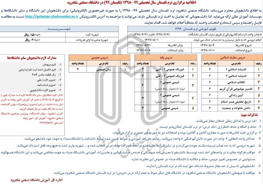 احتراماً به استحضار مي رساند دانشگاه صنعتي شاهرود در نظر دارد نسبت به برگزاري ترم تابستان 1399 به شرح اطلاعيه پيوست اقدام نمايد، لذا دانشجويانی که متمایل به اخذ واحد تابستانه می باشند طبق اطلاعیه پیوست به سایت گلستان دانشگاه با آدرس http://golestan.shahroodut.ac.ir مراجعه نموده و اقدامات لازم را انجام دهند.