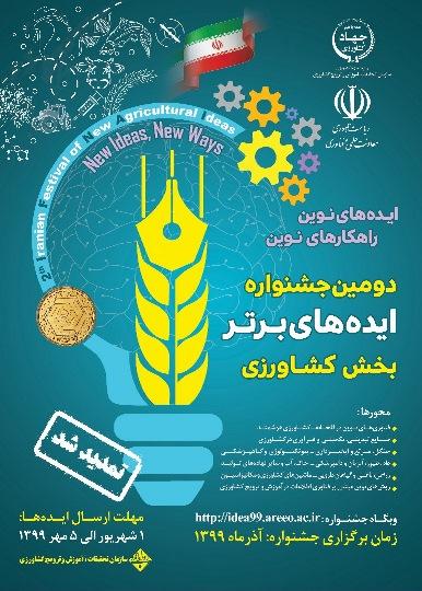 بدینوسیله به اطلاع دانشجویان عزیز و همکاران گرامی می رساند سازمان تحقیقات، آموزش و ترویج کشاورزی وزرارت جهاد کشاورزی دومین جشنواره ایده های برتر در بخش کشاورزی را برگزار می نماید. لذا علاقمندان می توانند جهت دریافت اطلاعات بیشتر به وبگاه http://idea99.areeo.ac.ir و یا ساب پورتال دفتر امور فناوری به آدرس fanavri.areeo.ac.ir مراجعه نمایند.